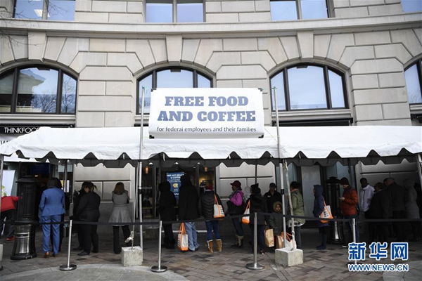 1月23日,在美國(guó)首都華盛頓,一些聯(lián)邦政府雇員在一家公益組織的“應(yīng)急食堂”外排隊(duì)領(lǐng)取免費(fèi)餐。 新華社記者 劉杰 攝