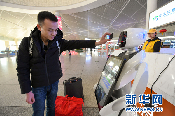 1月22日,在呼和浩特火車東站,旅客將車票放在智能機器人面前掃碼獲取乘車信息。新華社記者 彭源攝
