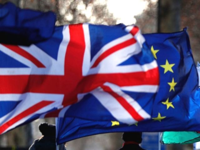 英國(guó)國(guó)旗(前)和歐盟旗幟。(新華社記者韓巖攝)