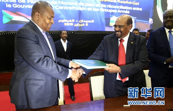 2月5日,在蘇丹首都喀土穆,蘇丹總統(tǒng)巴希爾(右)將和平協(xié)議文件交給中非共和國總統(tǒng)圖瓦德拉。新華社發(fā)(穆罕默德·海德爾攝)