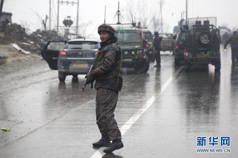 2月14日,在印控克什米爾首府斯利那加以南的普爾瓦馬地區(qū),印度士兵在襲擊現(xiàn)場附近警戒。新華社發(fā)(賈維德·達爾攝)