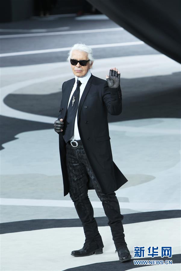 這是2013年3月5日在法國巴黎拍攝的卡爾·拉格菲爾德參加巴黎高級定制周香奈兒品牌時裝秀的資料照片。 新華社記者 高靜 攝