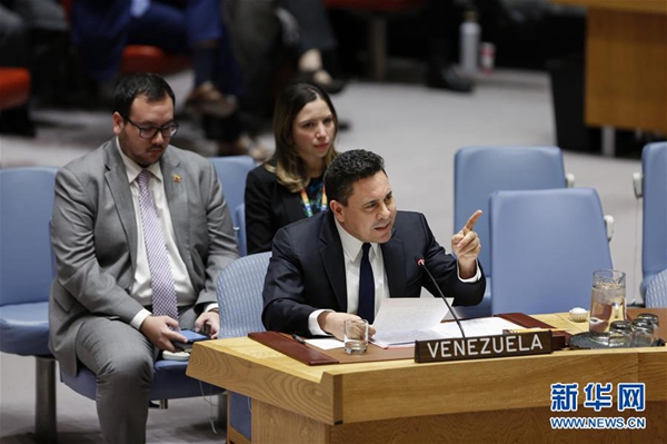 2月28日,在位于紐約的聯(lián)合國(guó)總部,委內(nèi)瑞拉常駐聯(lián)合國(guó)代表薩穆埃爾·蒙卡達(dá)(前)在安理會(huì)會(huì)議上發(fā)言。 新華社記者 李木子 攝