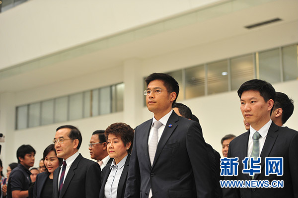 3月7日,在泰國曼谷,泰護國黨黨魁蓬帕尼(前右二)和同僚來到泰國憲法法院。新華社發(fā)(拉亨 攝)