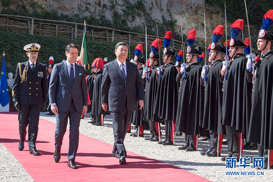 3月23日,國家主席習近平在羅馬同意大利總理孔特會談。這是習近平抵達時,孔特總理在停車處迎接。兩國領導人一同檢閱儀仗隊。新華社記者 李學仁 攝