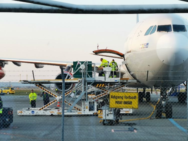 4月4日,在丹麥?zhǔn)锥几绫竟膭P斯楚普國(guó)際機(jī)場(chǎng),工作人員將裝有中國(guó)大熊貓的箱子搬出,準(zhǔn)備運(yùn)往哥本哈根動(dòng)物園。(新華社發(fā) 李鵬飛攝)