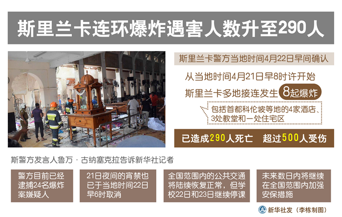 斯警方發(fā)言人魯萬(wàn)·古納塞克拉告訴新華社記者,警方目前已經(jīng)逮捕24名爆炸案嫌疑人,21日夜間的宵禁也已于當(dāng)?shù)貢r(shí)間22日早6時(shí)取消,全國(guó)范圍內(nèi)的公共交通將陸續(xù)恢復(fù)正常,但學(xué)校22日和23日繼續(xù)停課。