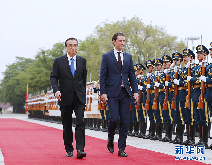 4月28日,國(guó)務(wù)院總理李克強(qiáng)在北京人民大會(huì)堂同奧地利總理庫(kù)爾茨舉行會(huì)談。這是會(huì)談前,李克強(qiáng)在人民大會(huì)堂東門(mén)外廣場(chǎng)為庫(kù)爾茨舉行歡迎儀式。新華社記者 劉彬 攝
