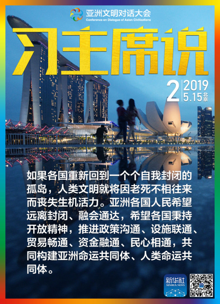 如果各國重新回到一個個自我封閉的孤島,人類文明就將因老死不相往來而喪失生機活力。亞洲各國人民希望遠離封閉、融會通達,希望各國秉持開放精神,推進政策溝通、設(shè)施聯(lián)通、貿(mào)易暢通、資金融通、民心相通,共同構(gòu)建亞洲命運共同體、人類命運共同體。