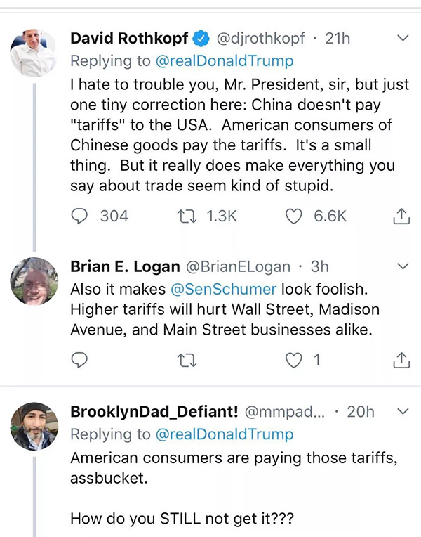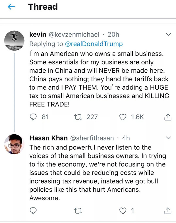 “我是一個擁有一家小企業(yè)的美國人。對我的生意來說,有些關(guān)鍵商品必須由中國制造而且永遠也不可能在美國生產(chǎn)出來。中國什么也沒付,是我付出了那些關(guān)稅!你給美國的企業(yè)們加上了巨大的稅賦!你正在扼殺自由貿(mào)易!”
