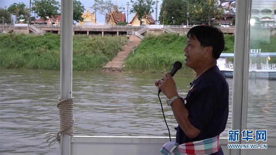 5月8日,在泰國那空拍儂府,那龍猜在湄公河游船上解說。58歲的那龍猜是泰國那空拍儂府湄公河游船上的志愿解說員。新華社記者郭鑫惠攝