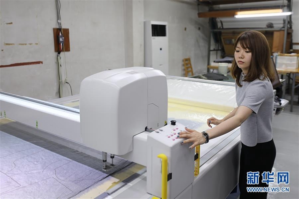 這是5月17日在日本和歌山縣,岡田織物公司的工作人員使用合作研發(fā)的專用機(jī)器剪裁人造毛皮。新華社記者 杜瀟逸 攝