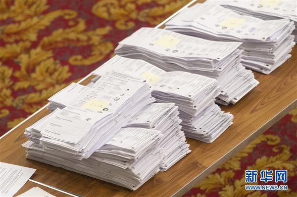 這是5月26日在英國南安普敦的一個計(jì)票站拍攝的選票。五年一次的歐洲議會選舉23日至26日在歐盟28個成員國間舉行。選民將選舉出751名議員,組成第九屆歐洲議會,任期5年。新華社發(fā)(雷伊·唐 攝)