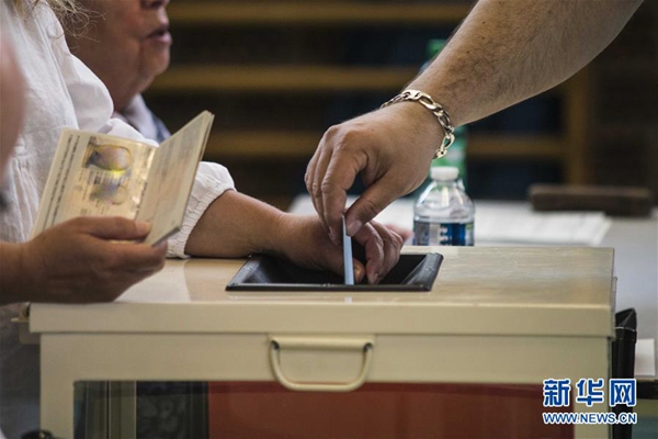 5月26日,在法國斯特拉斯堡,選民在一處投票站投票。新華社發(fā)(馬丁·勒列夫爾 攝)