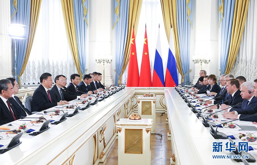 6月6日,國(guó)家主席習(xí)近平在莫斯科會(huì)見(jiàn)俄羅斯總理梅德韋杰夫。 新華社記者 姚大偉 攝