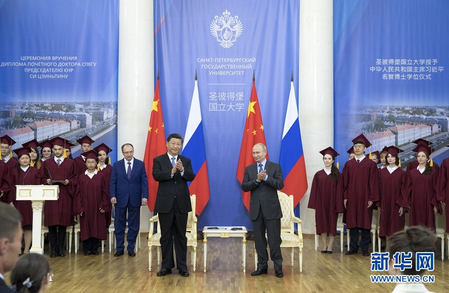 6月6日,國家主席習(xí)近平在圣彼得堡出席接受圣彼得堡國立大學(xué)名譽(yù)博士學(xué)位儀式。俄羅斯總統(tǒng)普京出席儀式。新華社記者 李濤 攝