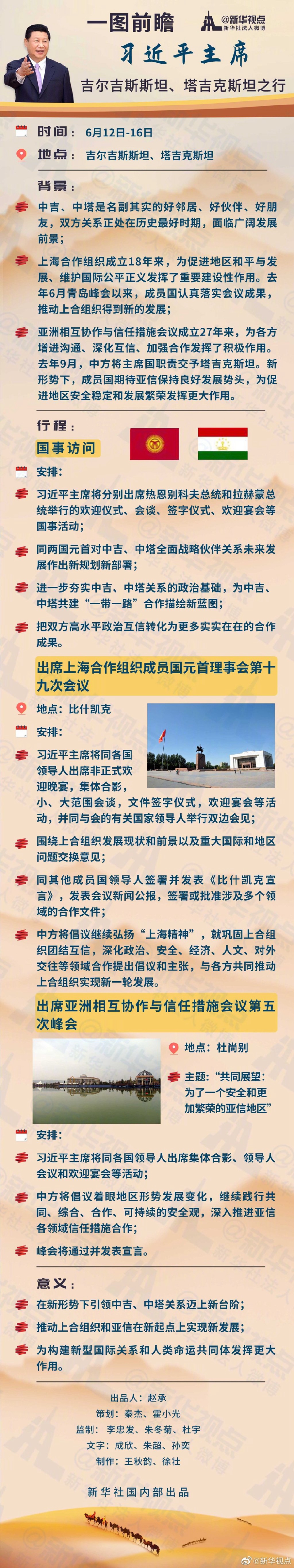 習(xí)近平主席將于6月12日至16日對(duì)吉爾吉斯斯坦、塔吉克斯坦進(jìn)行國(guó)事訪問并出席在比什凱克舉行的上海合作組織成員國(guó)元首理事會(huì)第十九次會(huì)議和在杜尚別舉行的亞洲相互協(xié)作與信任措施會(huì)議第五次峰會(huì)。這次出訪有啥看點(diǎn)?戳圖秒懂??