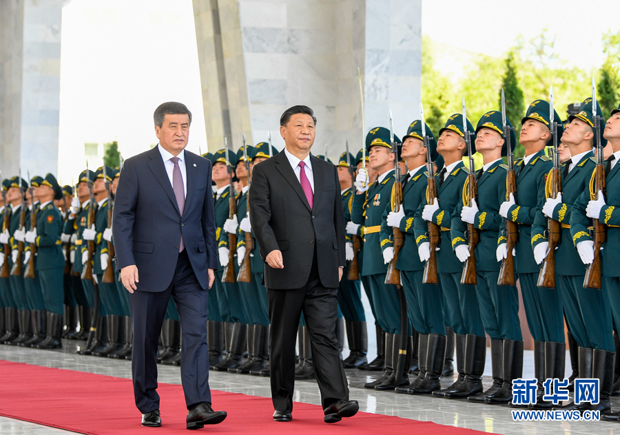 6月13日,國(guó)家主席習(xí)近平在比什凱克同吉爾吉斯斯坦總統(tǒng)熱恩別科夫會(huì)談。會(huì)談前,熱恩別科夫在阿拉爾恰國(guó)賓館會(huì)議中心前廣場(chǎng)為習(xí)近平舉行隆重歡迎儀式。這是兩國(guó)元首檢閱儀仗隊(duì)。 新華社記者 謝環(huán)馳 攝