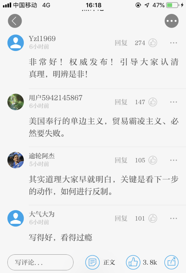 文章刊發(fā)后,網(wǎng)友紛紛轉(zhuǎn)發(fā)、點(diǎn)贊,表示“全面、清晰且深刻。”“權(quán)威發(fā)布!引導(dǎo)大家認(rèn)清真理,明辨是非!”“美國奉行的單邊主義,貿(mào)易霸凌主義、必然要失敗。 ”
