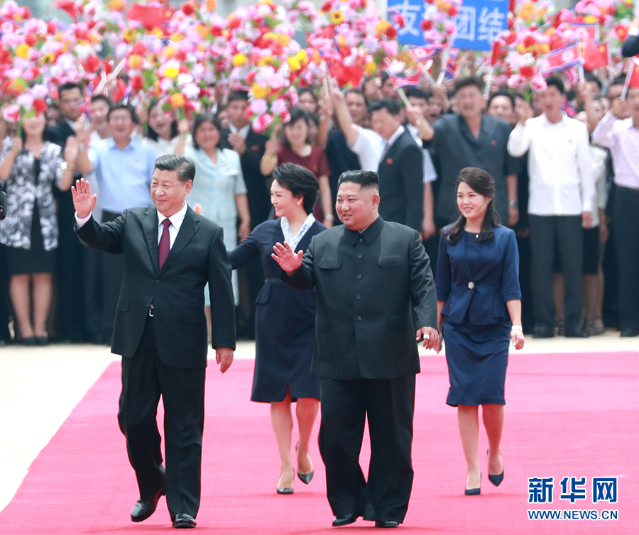 當(dāng)?shù)貢r(shí)間12時(shí)許,習(xí)近平乘坐的專機(jī)抵達(dá)平壤順安機(jī)場。雨后初晴的平壤,天高云淡、氣候怡人,到處郁郁蔥蔥、繁花似錦,整個(gè)城市洋溢著友好熱烈的氣氛。機(jī)場上中朝兩國國旗迎風(fēng)飄揚(yáng),“熱烈歡迎中國共產(chǎn)黨中央委員會(huì)總書記、中華人民共和國主席習(xí)近平同志”“鮮血凝成的朝中兩國人民之間牢不可破的友誼團(tuán)結(jié)萬歲”大幅標(biāo)語高高懸掛,近萬名群眾排列成整齊的隊(duì)伍,有力地?fù)]動(dòng)著花束,以歡快的口號和熱情的笑容,歡迎尊貴的中國客人到來。朝鮮勞動(dòng)黨委員長、國務(wù)委員會(huì)委員長金正恩和夫人李雪主到機(jī)場迎接。