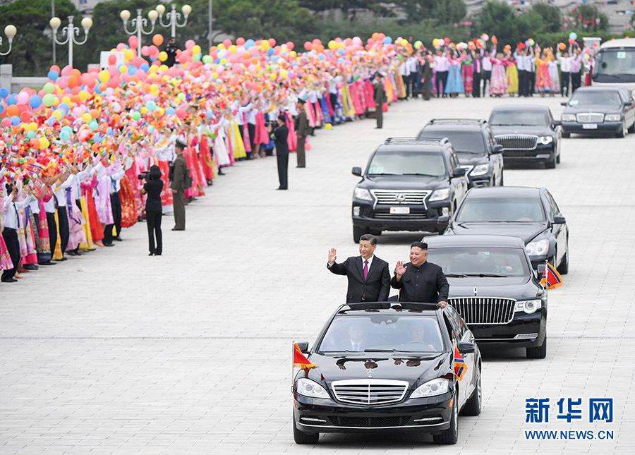 習(xí)近平抵達(dá)黎明大街路口,換乘敞篷車,與金正恩同車前往錦繡山太陽宮廣場。街道兩旁,人山人海,盛況空前。歡迎民眾站在高坡上,從住宅樓的窗臺(tái)上,向中國貴賓歡呼致敬。到處都是熱情的笑臉,友好的歡呼聲不絕于耳。習(xí)近平和金正恩向歡迎的人群頻頻揮手致意。