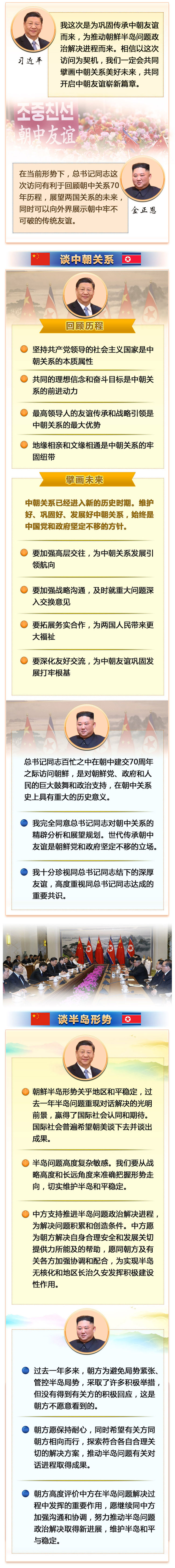 金正恩說,我代表朝鮮黨、政府和人民,熱烈歡迎習近平總書記對朝鮮進行國事訪問。總書記同志百忙之中在朝中建交70周年之際訪問朝鮮,是對朝鮮黨、政府和人民的巨大鼓舞和政治支持,在朝中關系史上具有重大的歷史意義。今天平壤有25萬多民眾涌上街頭,熱烈歡迎總書記同志。在當前形勢下,總書記同志這次訪問有利于回顧朝中關系70年歷程,展望兩國關系的未來,同時可以向外界展示朝中牢不可破的傳統(tǒng)友誼。我完全同意總書記同志對朝中關系的精辟分析和展望規(guī)劃。世代傳承朝中友誼是朝鮮黨和政府堅定不移的立場。我十分珍視同總書記同志結下的深厚友誼,高度重視同總書記同志達成的重要共識,愿以總書記同志這次訪朝為契機,推動朝中雙方進一步加強戰(zhàn)略溝通,深化各領域友好交往,把朝中關系不斷提升至新的高度。