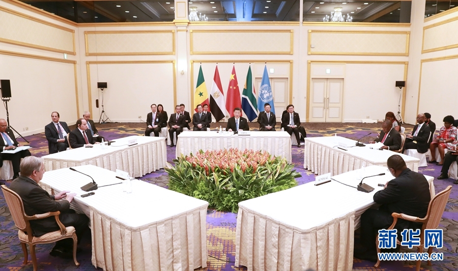 6月28日,國家主席習近平在大阪主持中非領導人會晤。中非合作論壇前任非方共同主席國南非總統(tǒng)拉馬福薩、非洲聯(lián)盟輪值主席國埃及總統(tǒng)塞西、中非合作論壇現(xiàn)任非方共同主席國塞內加爾總統(tǒng)薩勒和聯(lián)合國秘書長古特雷斯出席。 新華社記者 龐興雷 攝