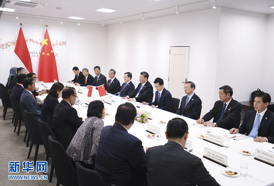6月28日,國家主席習(xí)近平在大阪會見印度尼西亞總統(tǒng)佐科。 新華社記者 燕雁 攝
