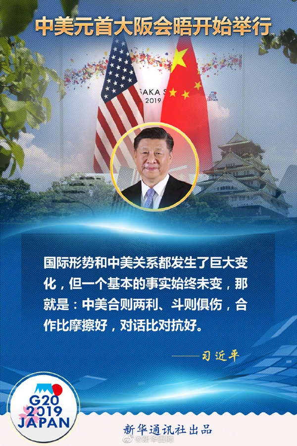 習(xí)近平在會晤開始時說,很高興同總統(tǒng)先生在大阪見面。48年前,也就是1971年,就在離這里100多公里的名古屋,參加第三十一屆世界乒乓球錦標(biāo)賽的中美乒乓球運動員進(jìn)行了友好互動,這就是后來人們說的“乒乓外交”的開啟,創(chuàng)造了“小球轉(zhuǎn)動大球”的歷史佳話。8年之后的1979年,中美建立了外交關(guān)系?;仡櫧ń灰詠淼?0年,國際形勢和中美關(guān)系都發(fā)生了巨大變化,但一個基本的事實始終未變,那就是:中美合則兩利、斗則俱傷,合作比摩擦好,對話比對抗好。近來,我同總統(tǒng)先生通過電話和書信保持著密切聯(lián)系。今天,我愿同總統(tǒng)先生就事關(guān)中美關(guān)系發(fā)展的根本性問題交換意見,為下階段兩國關(guān)系發(fā)展定向把舵,推進(jìn)以協(xié)調(diào)、合作、穩(wěn)定為基調(diào)的中美關(guān)系。