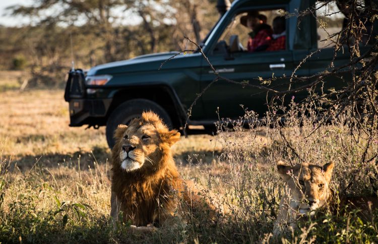 2018年7月7日,在肯尼亞馬賽馬拉大草原奧肯耶保護(hù)區(qū),星巴和當(dāng)?shù)匮策墕T觀察獅群情況。新華社記者呂帥攝