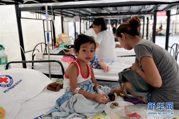 8月13日,在菲律賓甲米地省一處登革熱應急醫(yī)療站,一名母親照顧自己患病的孩子。新華社發(fā)(魯埃勒·烏馬利 攝)