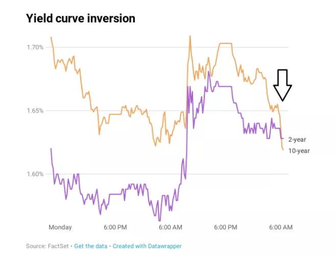 主要原因就是美國(guó)國(guó)債收益率曲線倒掛,債券市場(chǎng)預(yù)警美國(guó)經(jīng)濟(jì)衰退風(fēng)險(xiǎn)上升帶動(dòng)了投資者避險(xiǎn)情緒的上升。最新消息,美國(guó)30年期國(guó)債收益率14日降至歷史新低,10年期國(guó)債收益率自2007年以來(lái)首次降至兩年期國(guó)債收益率下方。經(jīng)濟(jì)學(xué)家和投資機(jī)構(gòu)紛紛警告,債券市場(chǎng)收益率曲線“倒掛”的反?,F(xiàn)象預(yù)示著美國(guó)經(jīng)濟(jì)衰退風(fēng)險(xiǎn)上升。