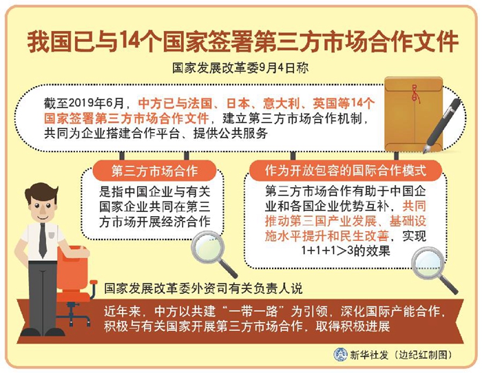 新華社北京9月4日電(記者安蓓)國家發(fā)展改革委4日稱,截至2019年6月,中方已與法國、日本、意大利、英國等14個國家簽署第三方市場合作文件,建立第三方市場合作機(jī)制,共同為企業(yè)搭建合作平臺、提供公共服務(wù)。