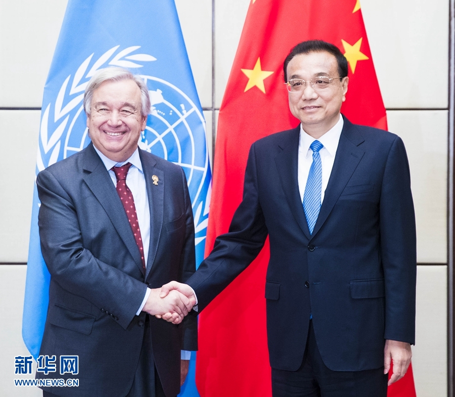 11月3日,國務(wù)院總理李克強(qiáng)在曼谷會(huì)見聯(lián)合國秘書長(zhǎng)古特雷斯。 新華社記者 黃敬文 攝