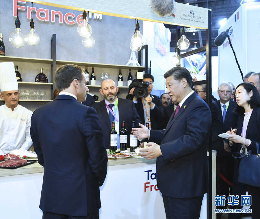 習(xí)近平在法國總統(tǒng)馬克龍陪同下首先來到法國館。馬克龍熱情邀請習(xí)近平品嘗法國紅酒和牛肉食品。在場法國企業(yè)家爭先恐后向習(xí)近平表示,法國企業(yè)看好中國市場,希望進(jìn)一步擴(kuò)大對華出口。習(xí)近平指出,中國消費(fèi)市場很大,可以滿足不同層次的多樣化需求,希望法國企業(yè)家展現(xiàn)長遠(yuǎn)眼光,同中國加強(qiáng)互利合作。