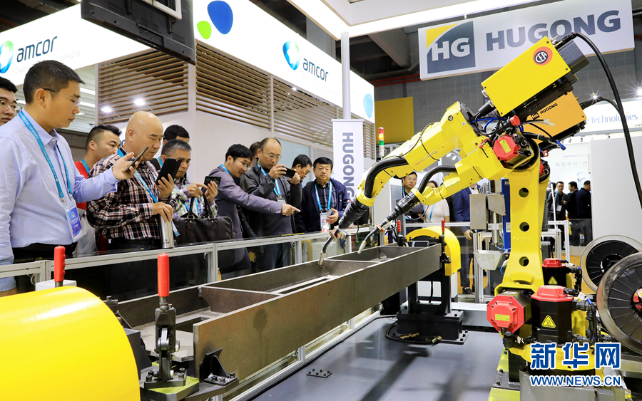 11月6日,在進博會裝備展區(qū),一組正在進行作業(yè)演示的焊接機器人吸引了參觀者的目光。當日是第二屆中國國際進口博覽會開幕第二天,上海國家會展中心迎來首個“大客流”。新華社記者 方喆 攝