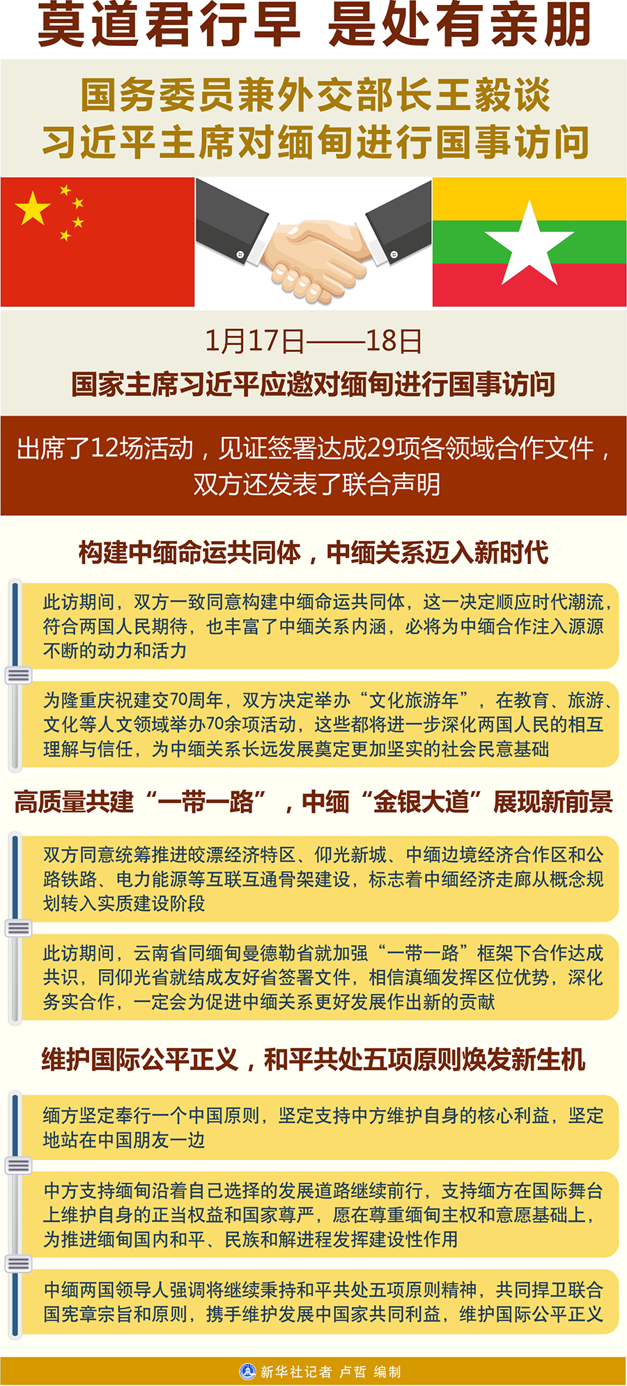新華社內(nèi)比都1月18日電? 1月17日至18日,國家主席習(xí)近平應(yīng)邀對(duì)緬甸進(jìn)行國事訪問。行程結(jié)束之際,國務(wù)委員兼外交部長王毅向隨行記者介紹此訪情況。
