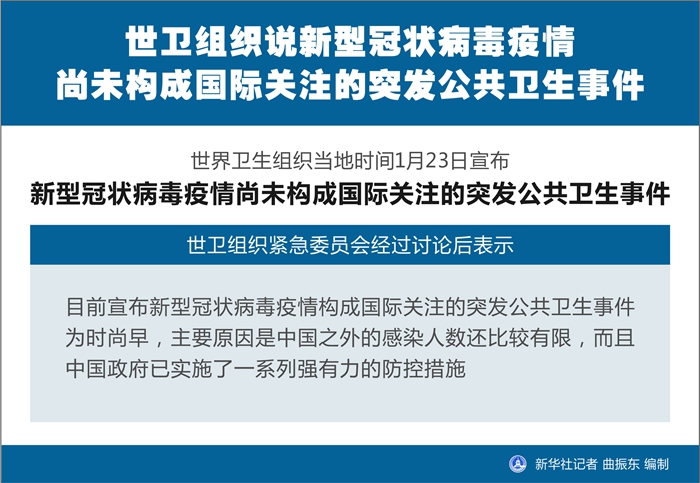 新華社日內(nèi)瓦1月23日電(記者劉曲 任珂)世界衛(wèi)生組織23日宣布,新型冠狀病毒疫情尚未構(gòu)成國(guó)際關(guān)注的突發(fā)公共衛(wèi)生事件。