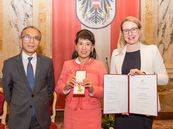 楊麗博士是2002年來(lái)第一位獲此殊榮的華人,也是獲得此項(xiàng)勛章的第一位華人女性。奧地利經(jīng)濟(jì)部長(zhǎng)瑪加麗特·施拉姆伯克親自向她頒發(fā)勛章和榮譽(yù)證書。中國(guó)駐奧地利大使李曉駟出席頒獎(jiǎng)儀式。