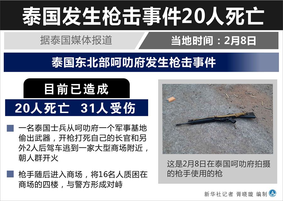 新華社曼谷2月8日電(記者汪瑾 任芊)據(jù)泰國媒體報道,泰國東北部呵叻府8日發(fā)生槍擊事件,目前已造成20人死亡、31人受傷。泰國特種部隊進入槍手藏身的商場,商場內大批民眾被疏散,但槍手目前所處位置尚不清楚。