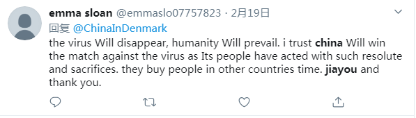 推特用戶emma sloan說(shuō):病毒將會(huì)消失,人類將會(huì)獲勝。我相信中國(guó)將會(huì)打敗病毒,因?yàn)橹袊?guó)人民采取了堅(jiān)決且富有犧牲精神的行動(dòng)。他們給其他國(guó)家的人民爭(zhēng)取了時(shí)間。加油,謝謝你們。