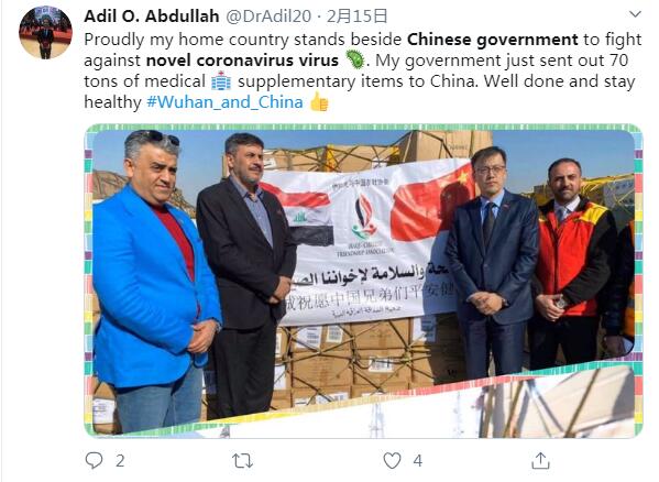 推特用戶Adil O. Abdullah說(shuō):我的祖國(guó)支持中國(guó)政府抗擊新冠肺炎病毒,我為此感到驕傲。我們的政府向中國(guó)送去了70噸的醫(yī)療補(bǔ)給物資,干得不錯(cuò)。武漢和全中國(guó)都要平安康泰。