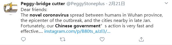 推特用戶Peggy-bridge cutter說(shuō):親愛(ài)的朋友們,新冠肺炎疫情在武漢和周邊城市暴發(fā)。所幸,中國(guó)政府采取了迅速、有效的行動(dòng)。
