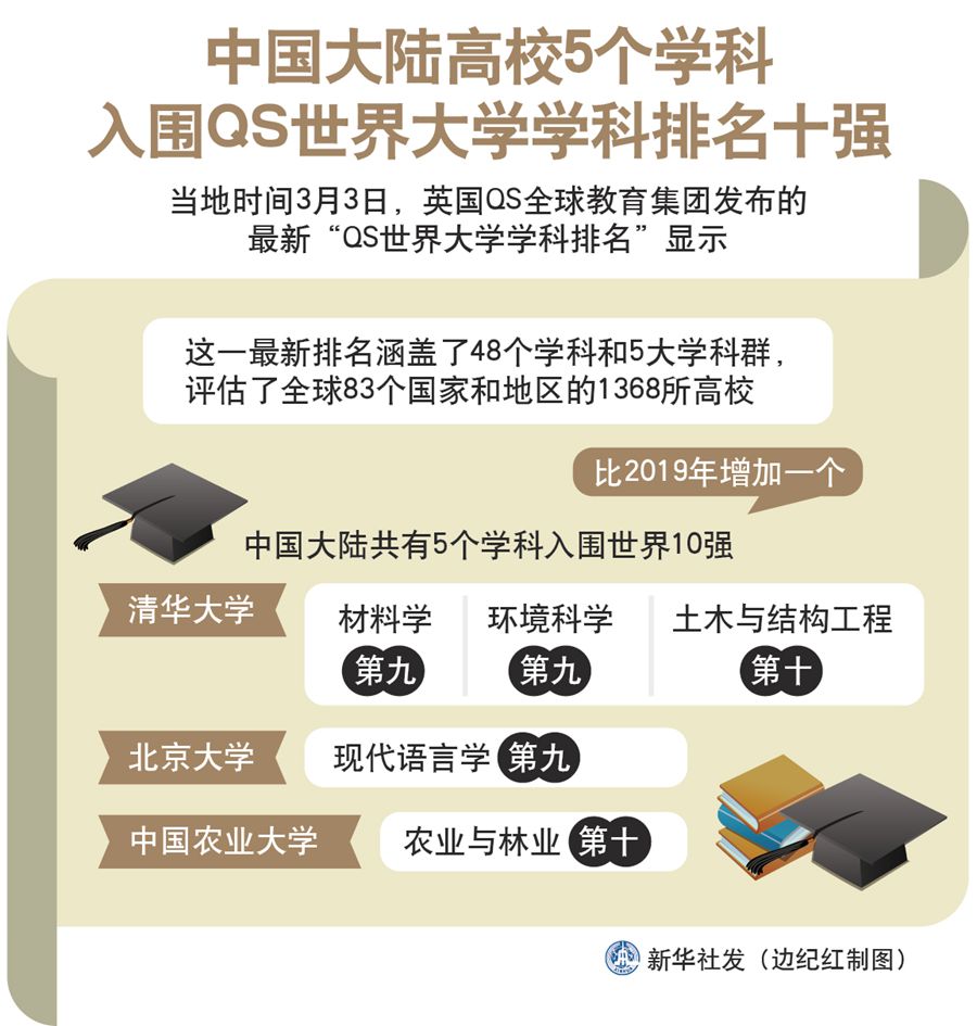 圖表:中國大陸高校5個學(xué)科入圍QS世界大學(xué)學(xué)科排名十強 新華社發(fā) 邊紀紅 制圖