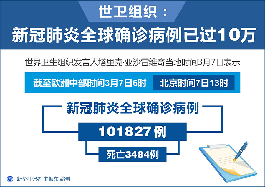 新華社日內(nèi)瓦3月7日電(記者劉曲 陳俊俠)世界衛(wèi)生組織發(fā)言人塔里克·亞沙雷維奇7日對(duì)新華社記者說,新冠肺炎全球確診病例數(shù)已突破10萬。