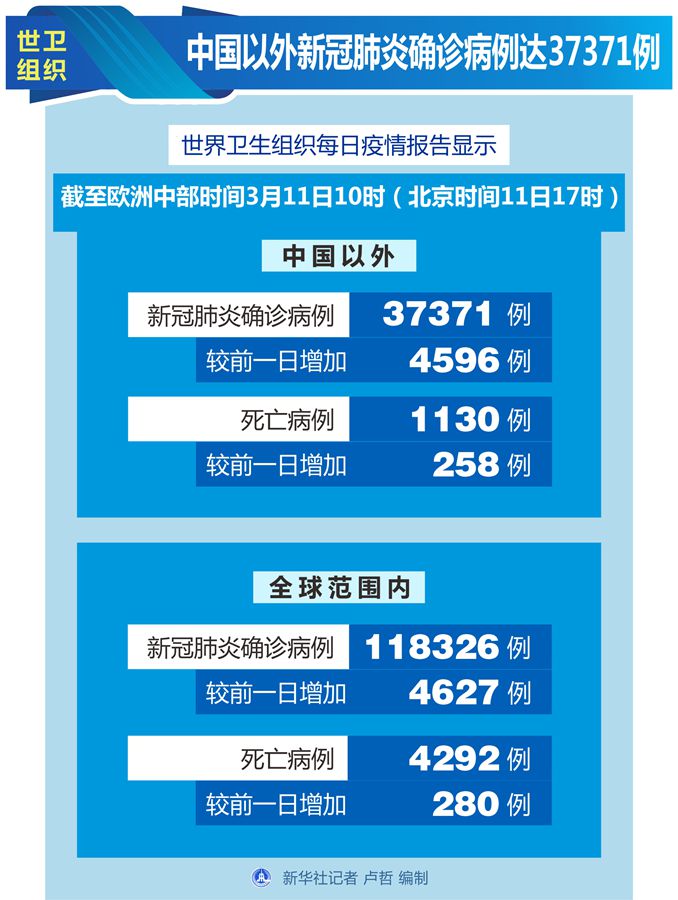 世衛(wèi)組織每日疫情報告顯示,截至歐洲中部時間11日10時(北京時間11日17時),中國以外新冠肺炎確診病例較前一日增加4596例,達到37371例;中國以外死亡病例較前一日增加258例,達到1130例。