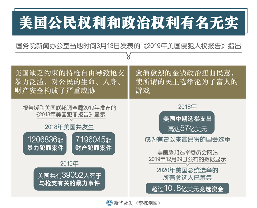 新華社北京3月13日電(記者王子銘、賈釗)國務(wù)院新聞辦公室13日發(fā)表的《2019年美國侵犯人權(quán)報告》指出,美國缺乏約束的持槍自由導(dǎo)致槍支暴力泛濫,對公民的生命、人身、財產(chǎn)安全構(gòu)成了嚴(yán)重威脅;愈演愈烈的金錢政治扭曲民意,使所謂的民主選舉淪為了富人的游戲。