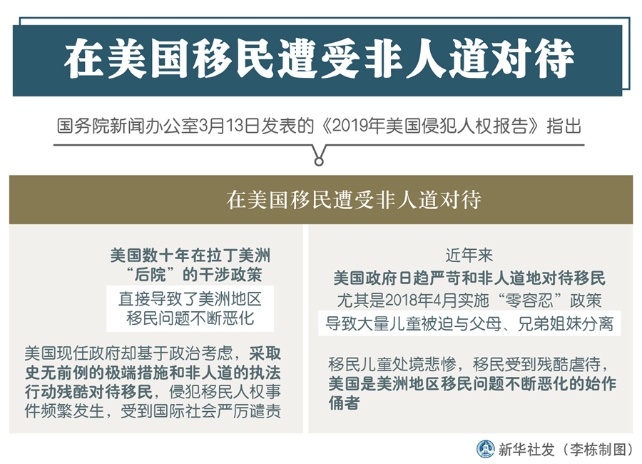 報(bào)告說(shuō),美國(guó)數(shù)十年在拉丁美洲“后院”的干涉政策直接導(dǎo)致了美洲地區(qū)移民問(wèn)題不斷惡化。美國(guó)現(xiàn)任政府卻基于政治考慮,采取史無(wú)前例的極端措施和非人道的執(zhí)法行動(dòng)殘酷對(duì)待移民,侵犯移民人權(quán)事件頻繁發(fā)生,受到國(guó)際社會(huì)嚴(yán)厲譴責(zé)。
