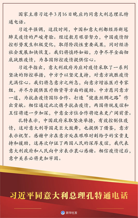 習(xí)近平指出,意大利政府為應(yīng)對疫情采取了一系列堅(jiān)決的防控舉措,中方予以堅(jiān)定支持,對意方戰(zhàn)勝疫情充滿信心。我們將急意方之所急,向意方增派醫(yī)療專家組,并盡力提供醫(yī)療物資等方面的援助。中方愿同意方一道,為抗擊疫情國際合作、打造“健康絲綢之路”作出貢獻(xiàn)。相信通過此次攜手抗擊疫情,兩國傳統(tǒng)友誼和互信將進(jìn)一步加深,中意全方位合作將迎來更廣闊前景。