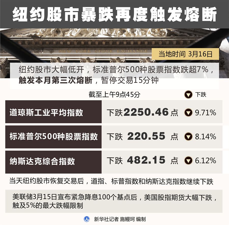 由于新冠肺炎疫情在美國(guó)持續(xù)擴(kuò)散引發(fā)市場(chǎng)廣泛擔(dān)憂,紐約股市16日開盤暴跌,并再次觸發(fā)7%的熔斷點(diǎn)。交易重啟后跌幅擴(kuò)大,收盤時(shí)紐約股市三大股指均暴跌超過(guò)11%。